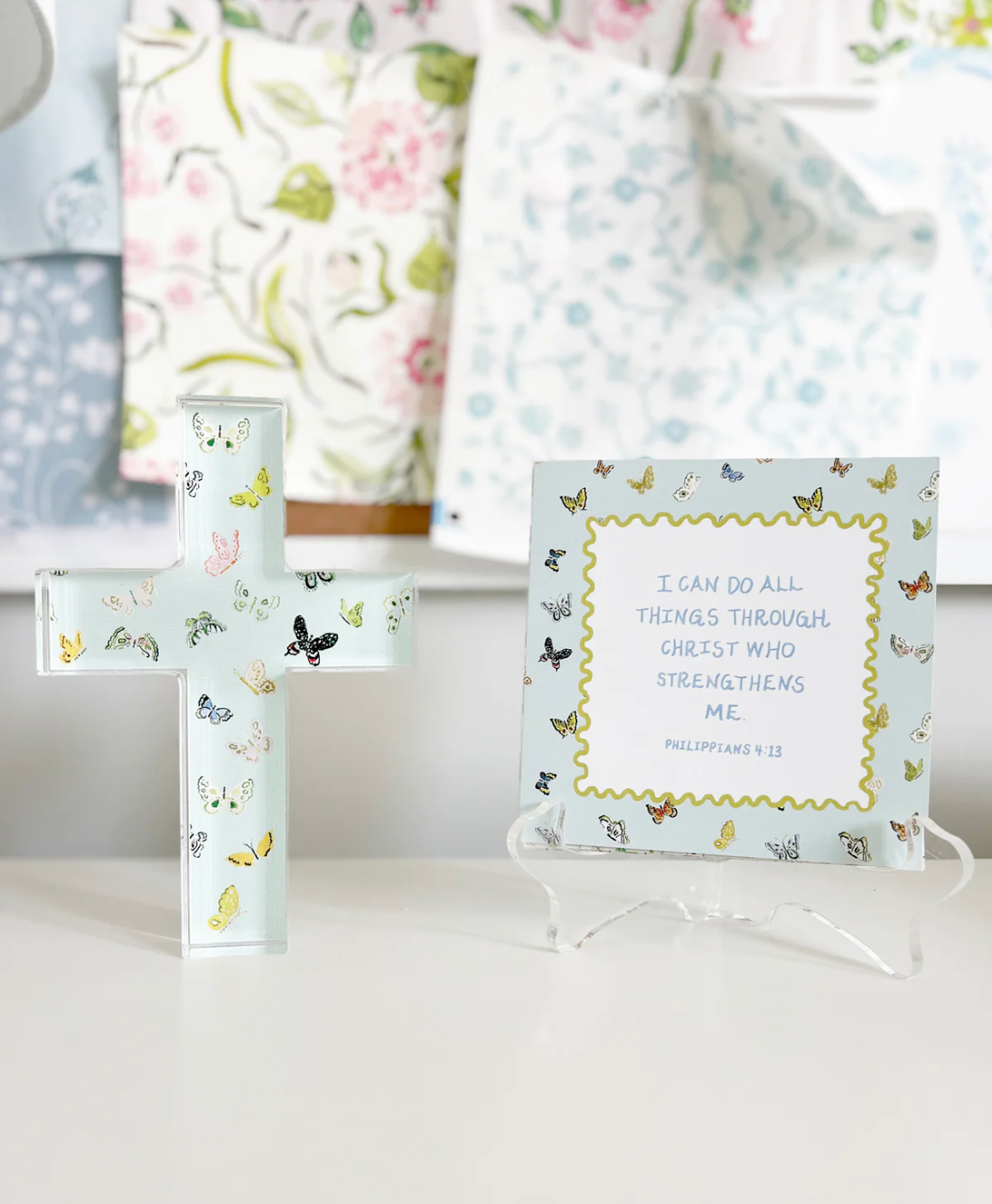 Elevate your desk with an acrylic block desk cross featuring one of Evelyn's whimsical watercolor patterns. As a daily reminder of hope and strength, these stylish tabletop pieces make meaningful gifts that add a touch of spirituality to your daily routine.